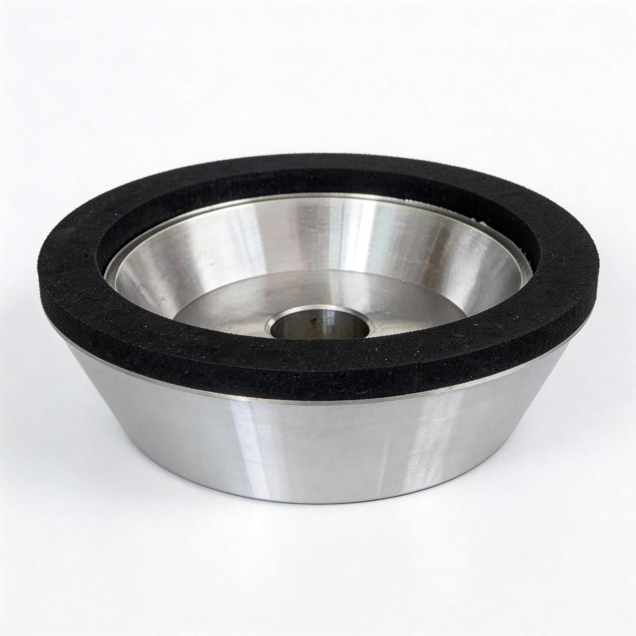 碗型主体结构,工作面为端面+70°斜锥面,带内孔安装定位台阶,装夹同轴度高,可同步完成端面与斜面磨削,适配万能工具磨床法兰装夹。