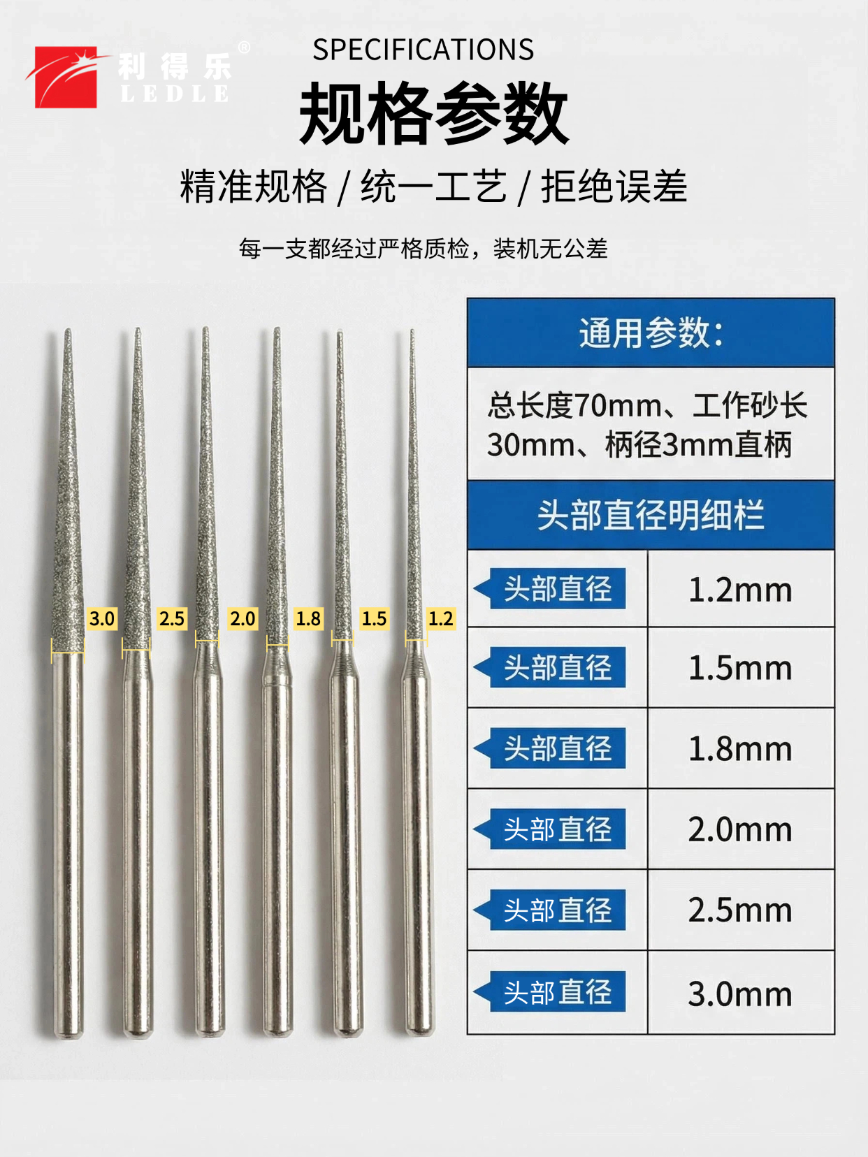 产品核心采用定长定制化设计,统一总长度 70mm,有效镀砂工作段固定为 30mm(远超行业常规磨针 5-15mm 的砂长规格),镀砂工作端直径覆盖 1.2mm-3.0mm 的小规格区间,分为等径同轴型与 3mm 通用柄变径型两大主流款式,适配不同加工设备与精度要求。